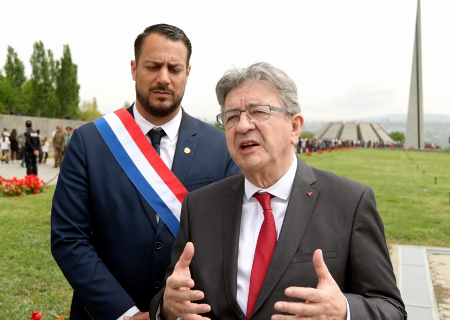 Jean-Luc Mélenchon a rendu hommage le 24 avril aux victimes du génocide arménien au mémorial de Dzidzernagapert à Erevan. Il était compagné de Sébastien Delogu, député marseillais de la France insoumise. Le leader de gauche qui donnera une conférence à l’UFAR ce jour, a également visité un peu plus tôt le cimetière militaire de Yerablour, où sont notamment enterrés des milliers de jeunes conscrits massacrés par les armes de dernière génération utilisée par la dictature du régime Aliev dans son opération de nettoyage ethnique de 2020 au Haut-Karabakh. Un voyage qui permet à cette figure centrale du paysage politique français de « marcher », comme il l’a écrit dans des tweets, « sur les pas de Jean Jaures », d’en appeler à « la reconnaissance du génocide arménien » pour la « construction honnête d’une conscience universelle », ou de célébrer « Missak Manouchian en compagnie Gilbert Lévon Minassian, alias Colonel Hovsepian, « marseillais et Arménien, devenu chef de guerre volontaire des Arméniens ».