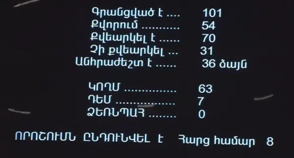 Le groupe « J’ai de l’honneur » a voté contre, comme l’a annoncé le chef de la faction Hayk Mamijanyan lors des discussions. Les députés du groupe(Arménie) n’ont pas participé au vote. C’est ce qu’a également annoncé le chef de la faction, Seyran Ohanyan.
